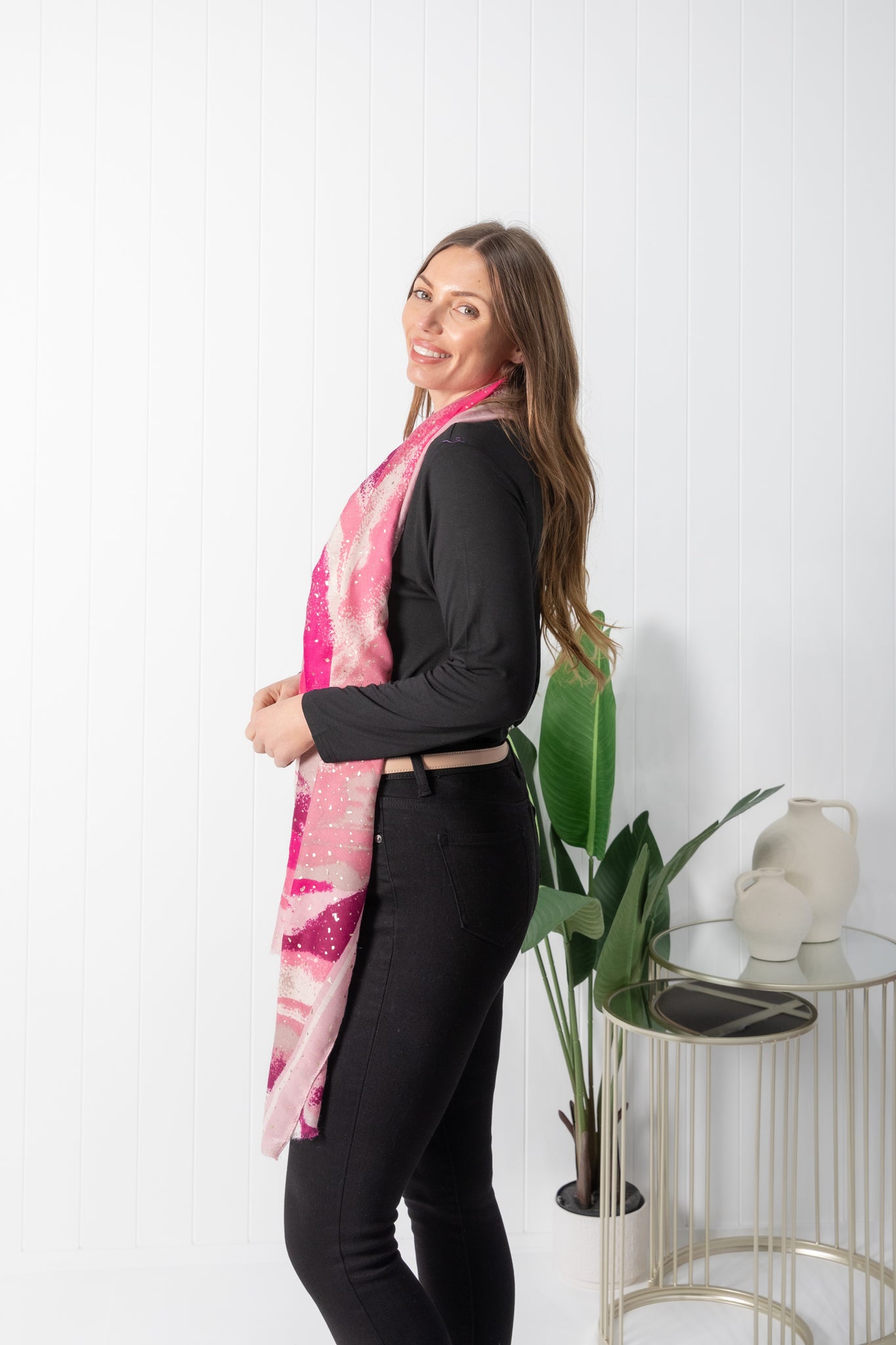 The Hannah Scarf offers a stylish addition to any outfit with its pink tones and gold specs. Made from a soft and gentle fabric, this scarf provides warmth and comfort while adding a pop of color. Style up your wardrobe with this fun and fashionable piece.