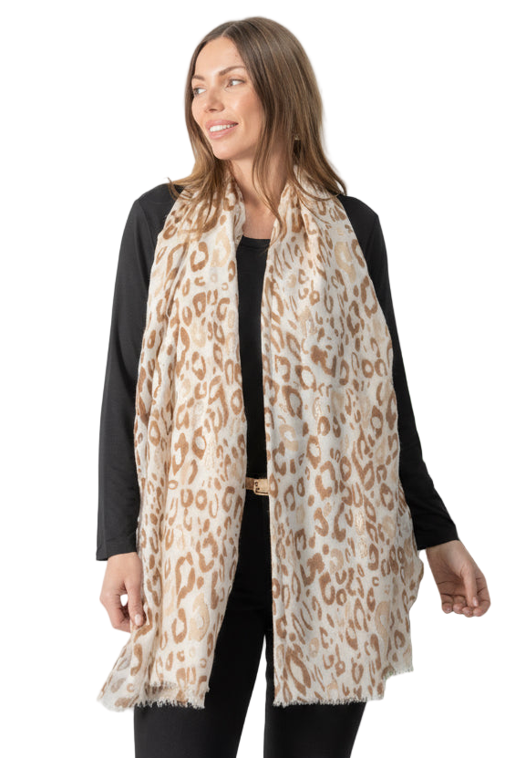 The Lillia Scarf offers a stylish addition to any outfit with its lighter brown tones and gold enhancements. Made from a soft and gentle fabric, this scarf provides warmth and comfort while adding a pop of color. Style up your wardrobe with this fun and fashionable piece.
