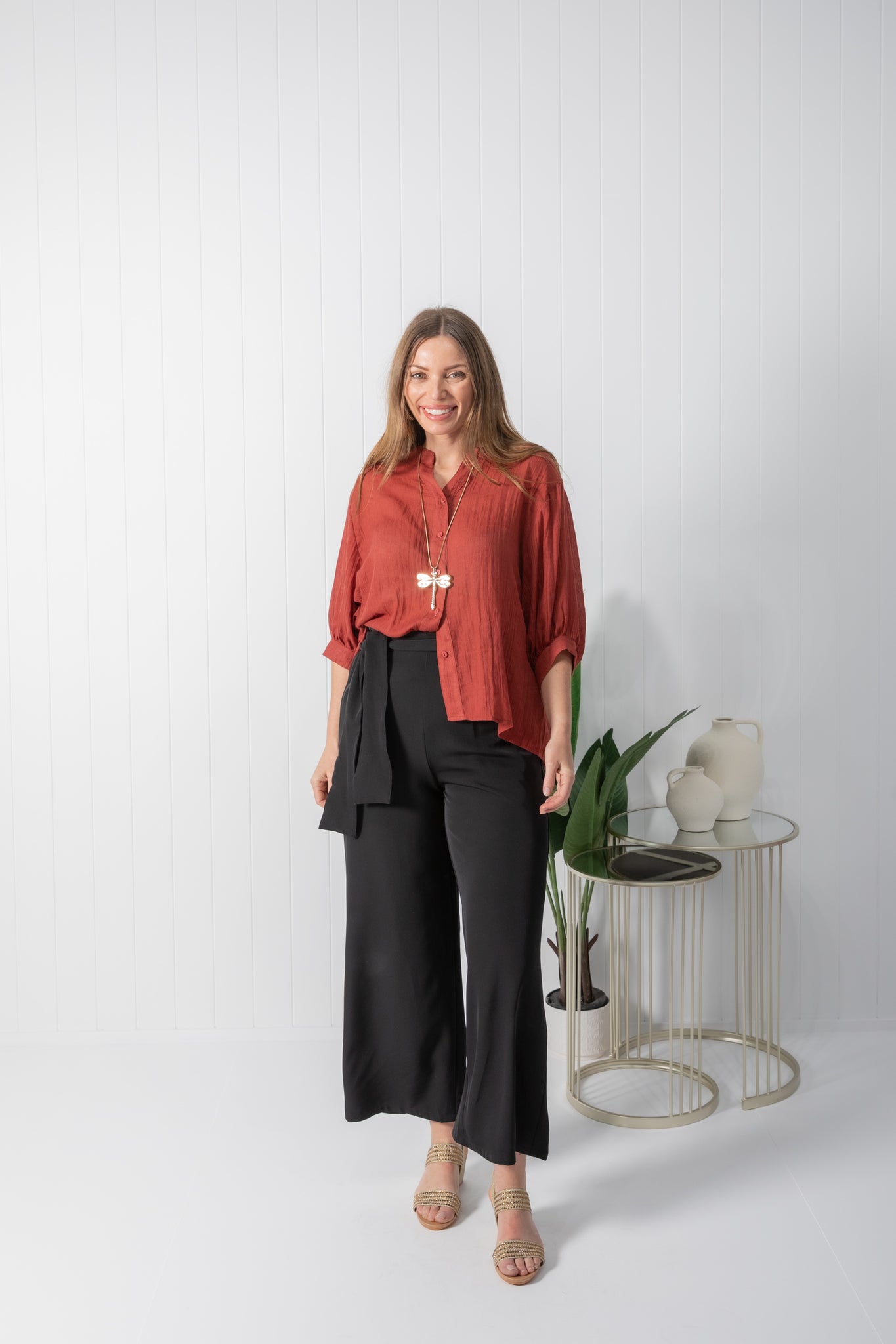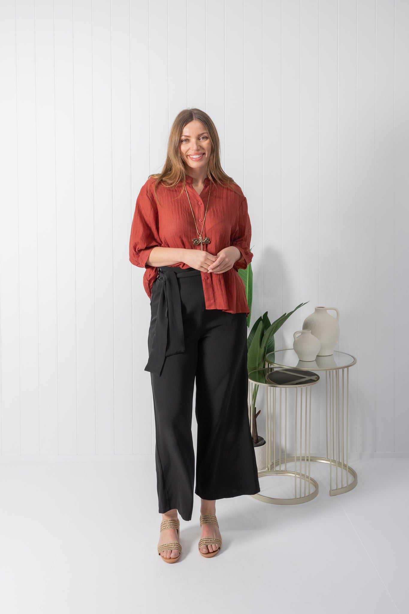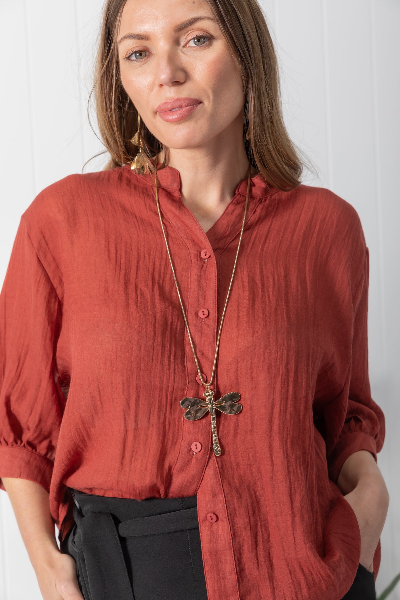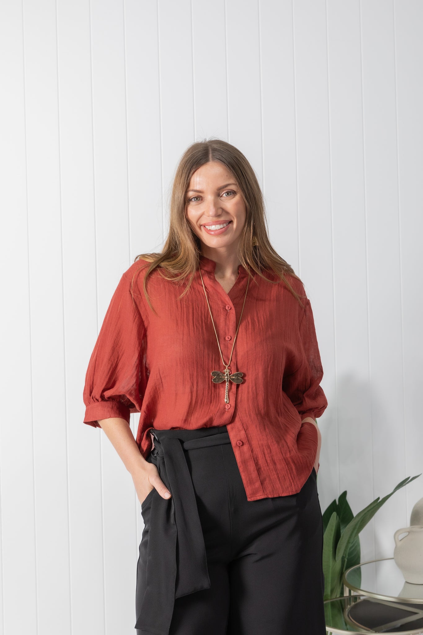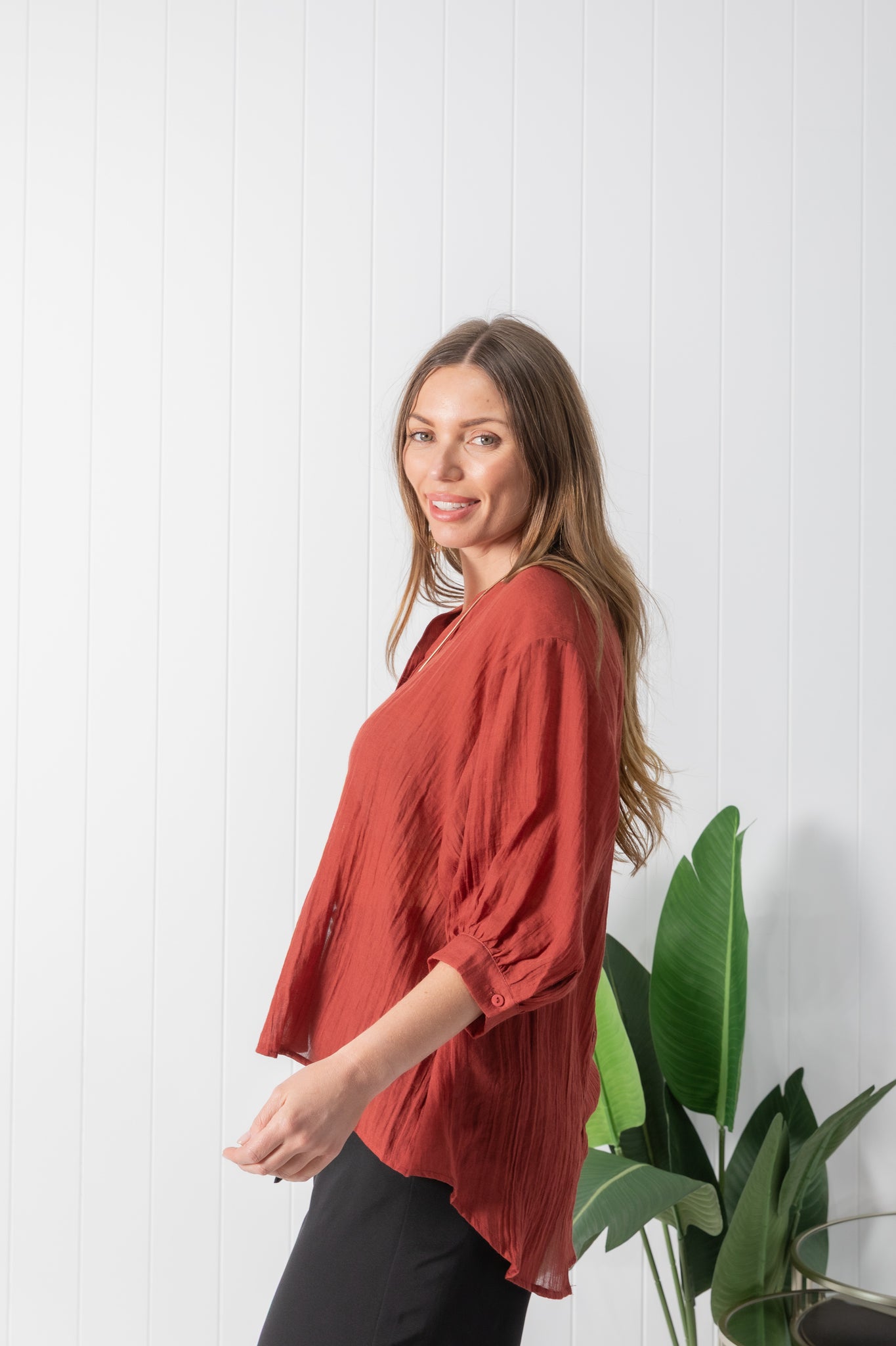 Experience a chic and effortless feel with the Tilly top. Featuring a beautiful solid deep auburn colour.